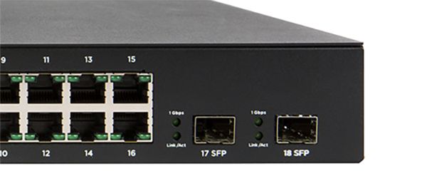 Bruk svitsjens SFP‑porter til å levere RJ45‑uplinks til andre enheter, eller fiber‑uplinks for å utvide nettverket over lange avstander med sterkere signal. Takket være en dedikert fabric deler de ikke backplane med noen av de andre portene, noe som betyr at du får full 1 Gbps uten å måtte ofre en PoE‑port for å bruke dem (ingen kombiporter her!).