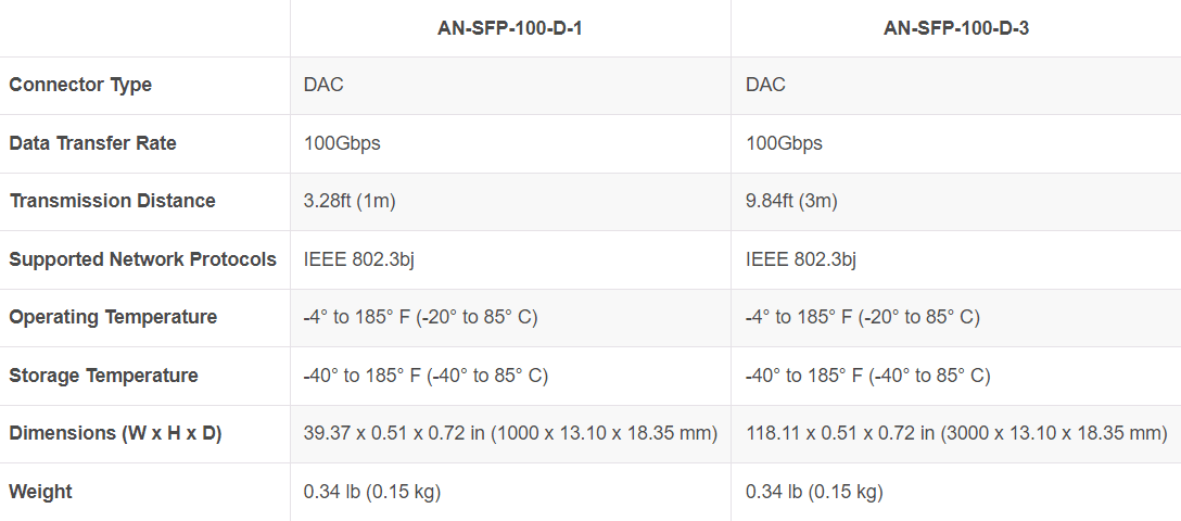 Supports data speeds up to 100Gbps over a 1m or 3m Passive Copper DAC cable.