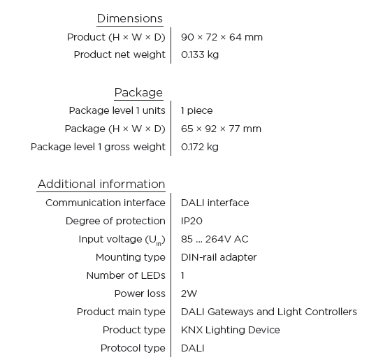 For controlling DALI devices via the KNX bus. One DALI output for up to 64 DALI secondary products. DALI power supply is integrated. Control and status feedback is carried out via KNX per DALI slave (64), with lighting groups (16), together in broadcast or per scenes (16). Extensive fault and error messages are available with a self-contained emergency converter (64), according to EN 62386-202 is supported. Various emergency tests (e.g. function and duration tests) can be triggered via KNX and emergency converter. Feedback is sent. Slave, staircase, force, block, and scene functions are integrated. DALI telegram rate can change. For diagnostic use and individual change of the DALI address or group assignment, a separate Software-Tool is available.