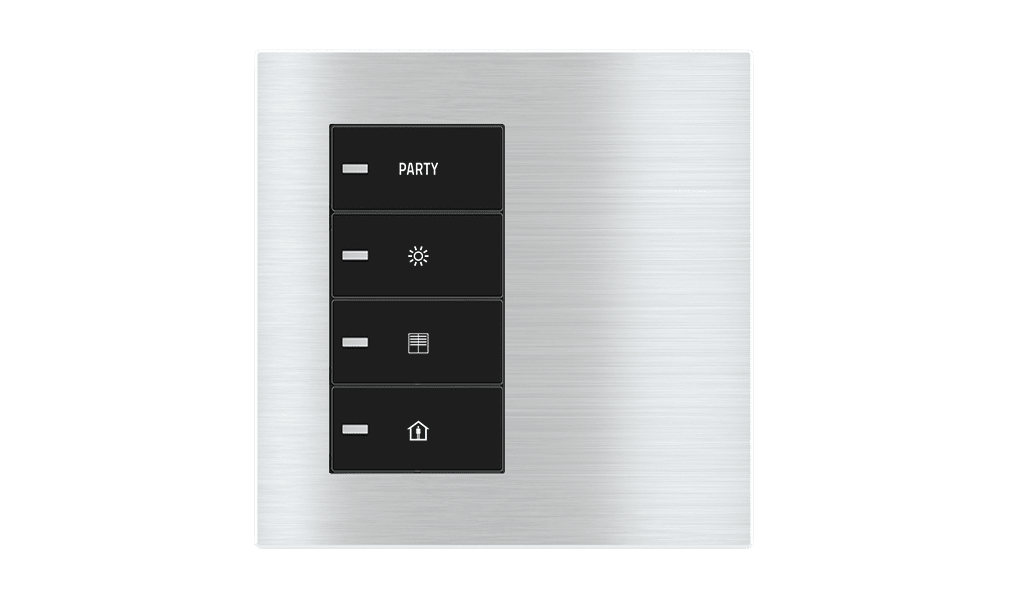 The Ekinex® 20venti series 4-fold pushbutton is used for on/off control of utility devices, dimming of luminaires, control of motorized drives for roller shutters or other programmable control functions. Thanks to the integrated temperature sensor, the button can act as a temperature controller for a room or zone. RGB LED for each rocker. The switch has an integrated KNX bus communication module and is designed for installation in a flush-mounted wall box.