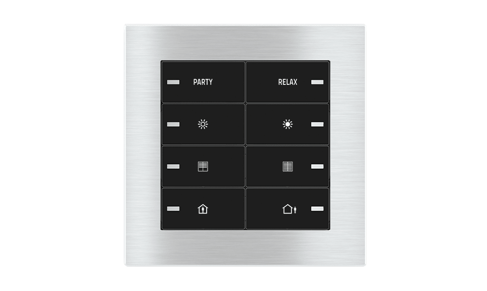 The Ekinex® 20venti series 8-fold pushbutton is used for on/off control of utility devices, dimming of luminaires, control of motorized drives for roller shutters or other programmable control functions. Thanks to the integrated temperature sensor, the button can act as a temperature controller for a room or zone. RGB LED for each rocker. The switch has an integrated KNX bus communication module and is designed for installation in a flush-mounted wall box.