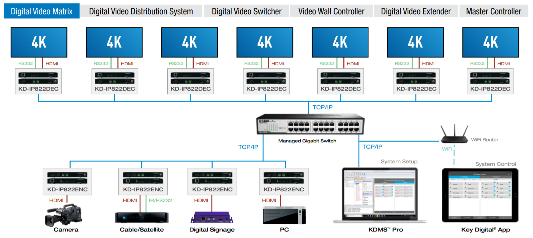 - Control System Support: Key Digital® app ready. Key Digital Management Software™ Pro (KDMS™ Pro) ready, Compass Control® Pro ready. Fully controllable by all IR, RS-232, and TCP/IP supported control systems via open API.