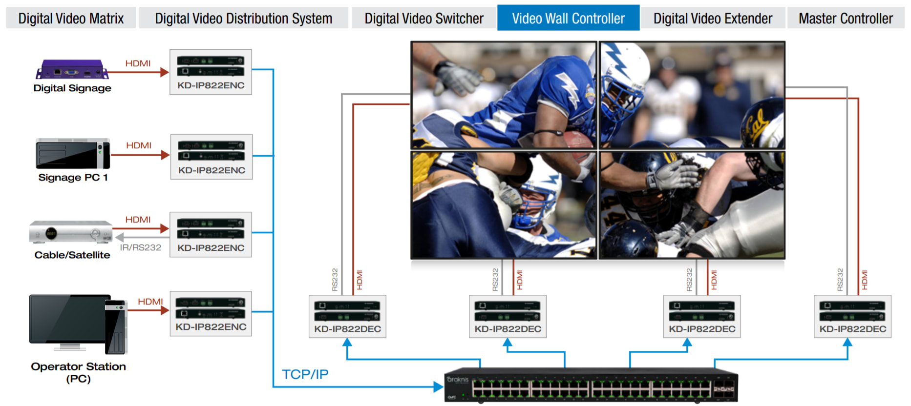 - Enterprise AV Over IP: Utilizes a managed gigabit network switch to enable video distribution, matrix switching, and extension