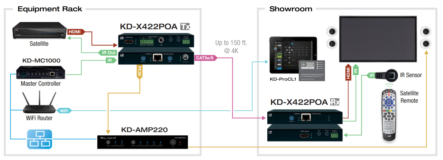 - Up to 150 ft. @ 4K 24/25/30(4:4:4)/60(4:2:0) using KD-CAT6STP1X cabling