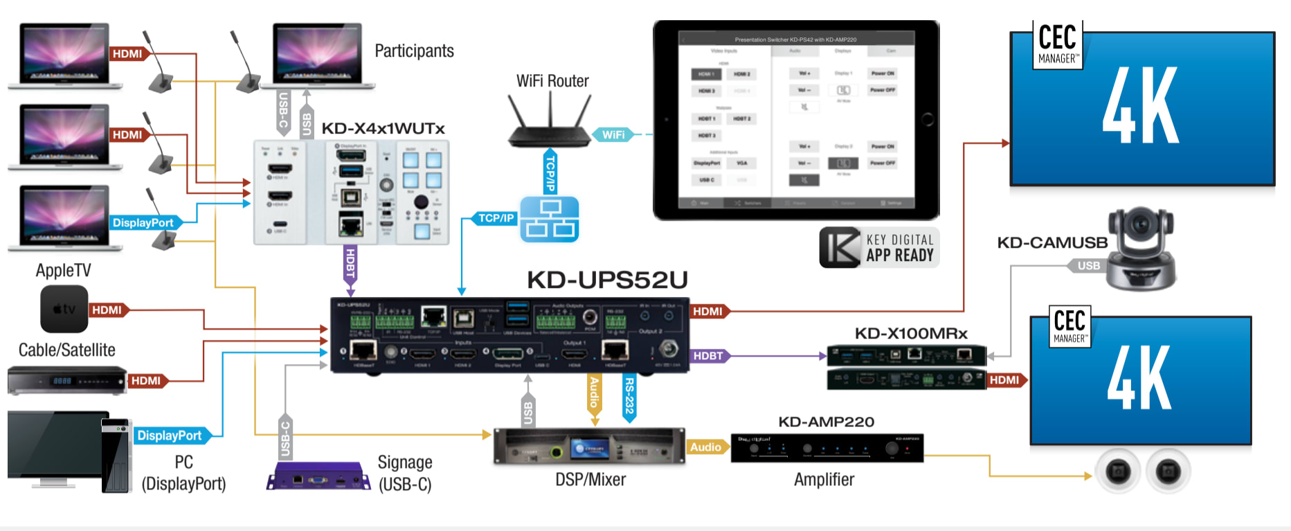PTZ USB Camera Integration: Marries natively with KD-CAMUSB for full PTZ control via KD-App with supported presentation switcher