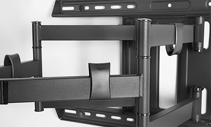 TV-produsenter endrer stadig plasseringen av strømtilkoblinger, innganger og utganger på baksiden av TV-en, så vi har sørget for en løsning som passer til ethvert design. Det dobbelarmede leddfestet leveres med en H-mønsterbrakett som er VESA-kompatibel opptil 600 x 400 (Large) og 800 x 600 (XL). Hvis en mindre 400 x 400 X-mønsterbrakett er alt du trenger, kan den kjøpes separat og er kompatibel med samme TV-monteringshode.