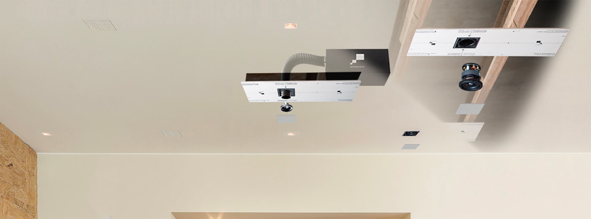 Høyttalere fra Sonance Architectural Series og Discreet Opening System installeres ved hjelp av prefabrikerte patenterte monteringsplattformer for å oppnå et perfekt resultat. Monteringsplattformen installeres som en del av taket, er 16mm tykk og tilpasset kvadratisk høyttaler.