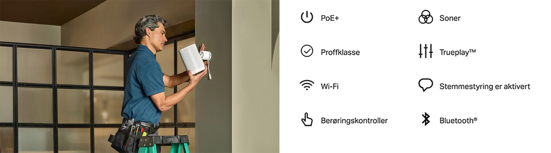 Sonos ERA 100 Pro er designet for profesjonell installasjon, og gjenskaper den ikoniske Sonos-høyttaleren med PoE+ og sonefunksjonalitet.