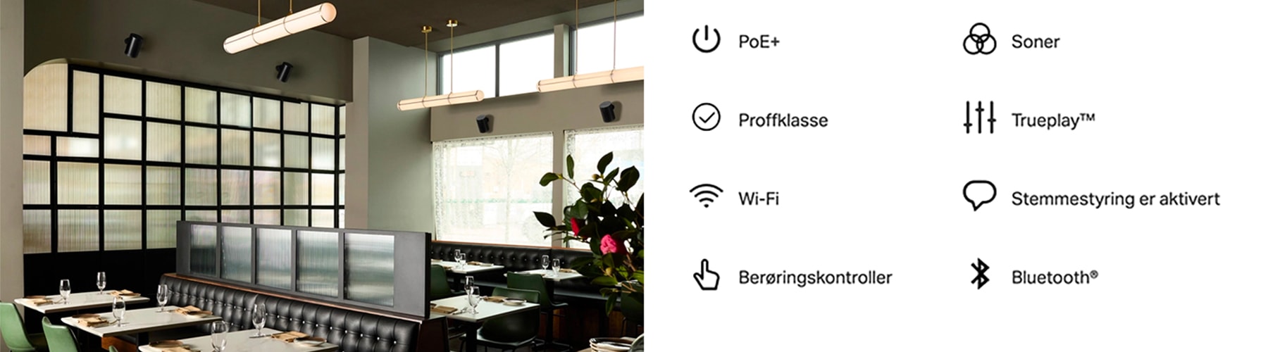 Sonos ERA 100 Pro er designet for profesjonell installasjon, og gjenskaper den ikoniske Sonos-høyttaleren med PoE+ og sonefunksjonalitet.