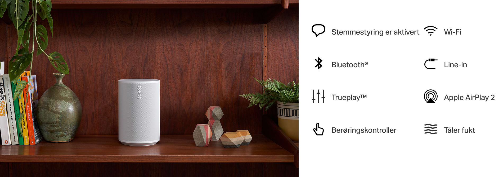 Spill enkelt av all lyd med Wi-Fi og Bluetooth. Koble til en platespiller eller en annen kilde med kabel og en Sonos line-in-adapter. Få håndfri styring med stemmen din. Sett to i samme rom for enda rikere stereolyd eller omsluttende surroundlyd for hjemmekinoen. Legg til flere Sonos-høyttalere i hjemmet for fantastisk lyd i alle rom.
