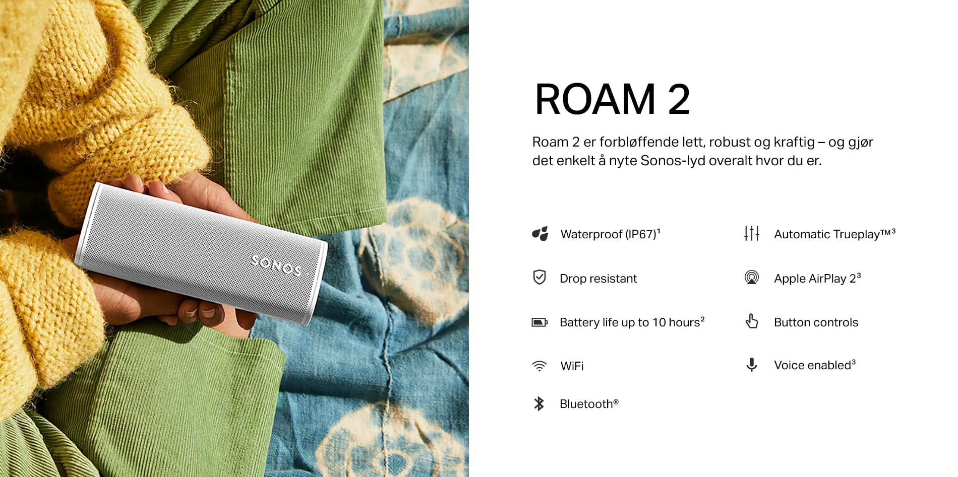 Vi presenterer Sonos Roam 2. Den bærbare høyttaleren for lyttere som ikke vil inngå kompromisser. Roam 2 er forbløffende lett, robust og kraftig – og gjør det enkelt å nyte Sonos-lyd overalt hvor du er.