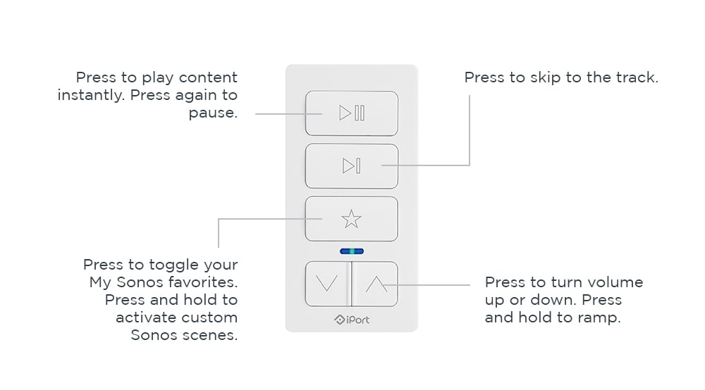 With xPRESS, you now have a convenient, wireless keypad that can be installed anywhere, giving you instant-access buttons for your Sonos system. With just a press, start playing music in a Sonos zone, advance tracks, and ramp volume levels. You can even select specific favorite playlists or active a whole-house Sonos scene with the xPRESS Star button.