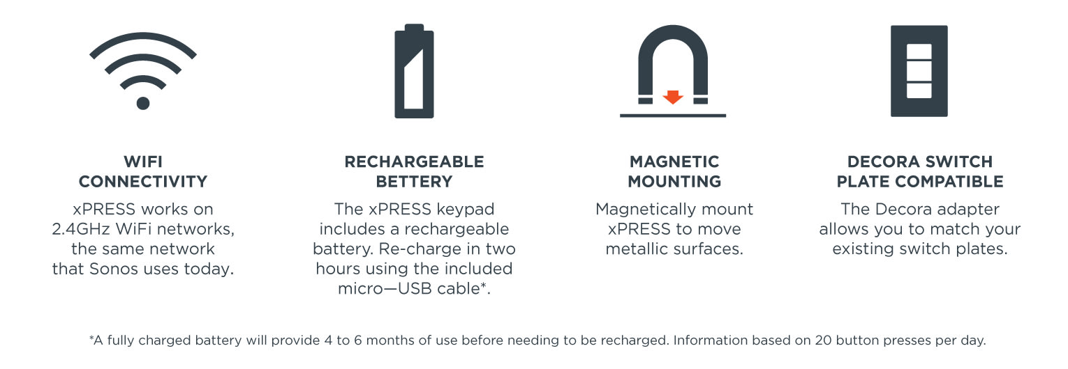 The xPRESS Audio Keypad works on 2.4GHz WiFi and includes a rechargeable battery for 4 to 6 months of use before needing to be recharged. With options to magnetically mount your Keypad on a metallic surface, wall, or coffee table, xPRESS gives you instant control of your Sonos players throughout your home, allowing you to access music anywhere you want.
